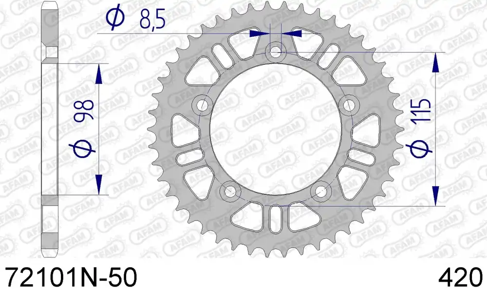 De AFAM REAR ALU 50T, 420, BLACK is een hoogwaardige achtertandwiel, speciaal ontworpen voor motoren die een 50T tandwiel nodig hebben. Dit sprocket is vervaardigd uit lichtgewicht aluminium, wat niet alleen bijdraagt aan de prestaties van je motor, maar ook zorgt voor een langere levensduur. Het zwarte ontwerp geeft je voertuig een sportieve uitstraling.