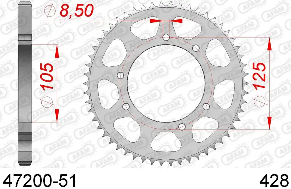 Controleer de specificaties van je huidige sprocket en vergelijk deze met de AFAM REAR STEEL 51T, 428. Deze sprocket heeft 51 tanden en is geschikt voor een 428 kettingmaat.