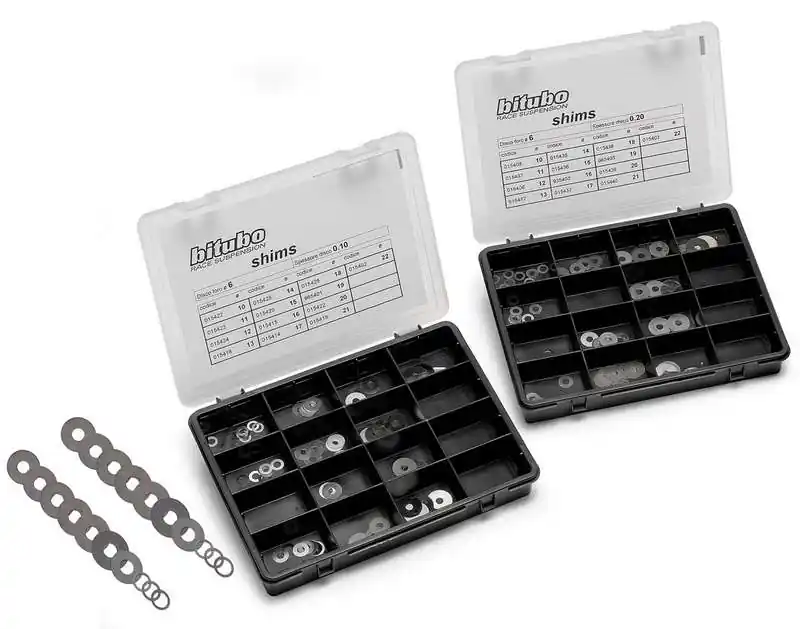 De BITUBO SHIMS BOX is uniek door zijn specifieke afmetingen van 6 mm inwendige diameter en 0.15 mm dikte. Deze eigenschappen zorgen voor een uitstekende pasvorm en functionaliteit in de vering van je voertuig.