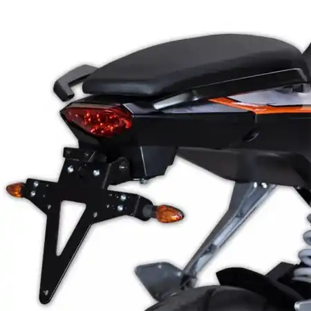 Kentekenplaathouder voor de KTM Duke 200 (controleer in de motorlijst het bouwjaar van de Duke 200). Deze kentekenplaathouder is van degelijke Duitse kwaliteit en wordt geleverd met een lange en korte variant.