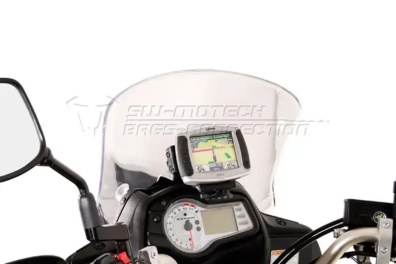 Speciale anti-schok houder voor GPS apparatuur op je Suzuki DL650 V-Strom (controleer in de motorlijst het bouwjaar van de DL650 V-Strom). De navigatiehouder is uitgevoerd in zwart. De klem is voorzien van gaten waardoor GPS-systemen van TomTom en Garmin zonder problemen zijn te monteren.