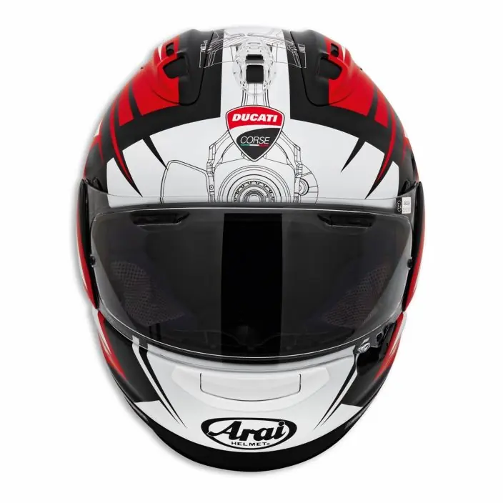 De binnenbekleding van fijn Eco-Pure® hypoallergeen materiaal en nekpadding zijn verwijderbaar en wasbaar. Comfort, veiligheid en afdichting zijn de sleutelkenmerken van deze helm met een agressieve uitstraling, waarvan het rood en zwarte kleurenschema het ontwerp van de motor op een witte achtergrond omlijst, waardoor de aandacht direct wordt gericht op het kloppende hart van de “Rode” motoren van Borgo Panigale.