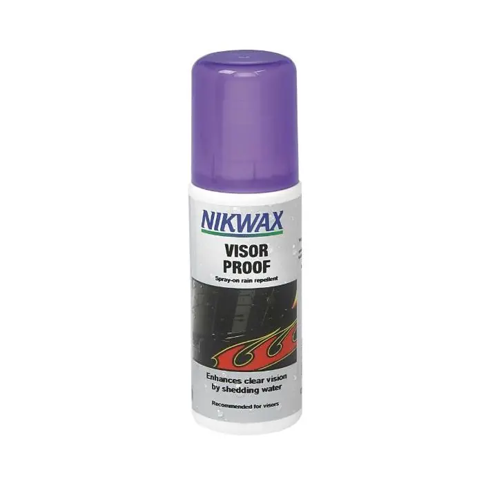 Nikwax Visor Proof spray voorkomt dat regendruppels blijven hangen op het vizier.