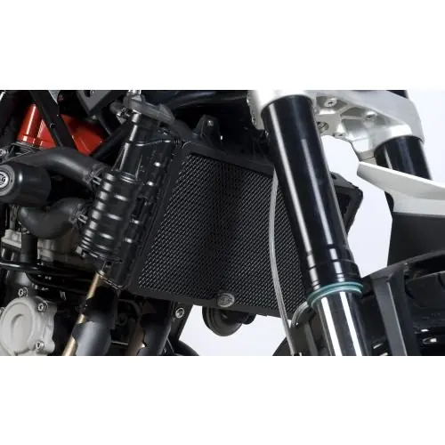 Radiatorscherming voor de Husqvarna Nuda 900 (controleer in de motorlijst het bouwjaar van de Nuda 900) in de kleur zwart van het merk R&G. Deze radiatorgril beschermt tegen steenslag en beschadiging van je radiator en ziet er ook nog een erg mooi uit. Montage van de radiatorcover op je Husqvarna Nuda 900 is zeer eenvoudig en is prima uit te voeren. Er hoeven verder geen aanpassingen te worden gedaan aan je motor, deze wordt op bestaande punten van je Husqvarna Nuda 900 gemonteerd (soms met meegeleverde tie-wraps als op een bepaald punt geen goed montagepunt aanwezig is).