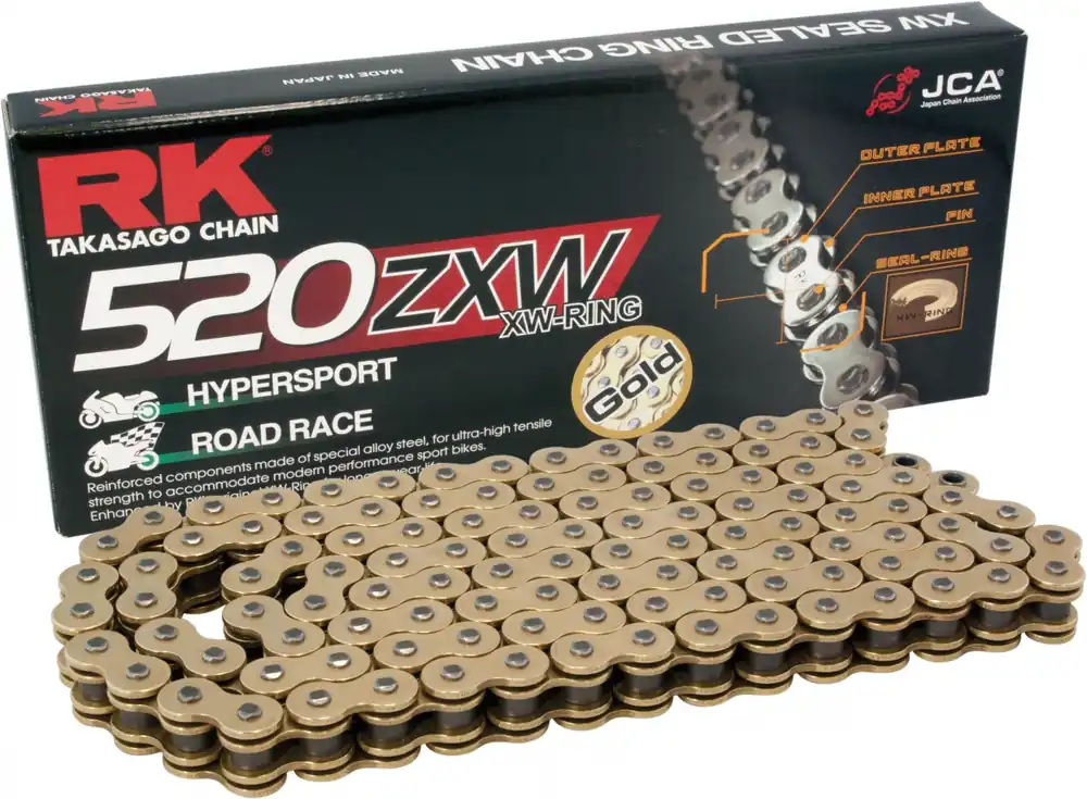 De RK GB520ZXW is een hoogwaardige ketting die speciaal is ontworpen voor motoren. Met 114 CLF rivets biedt deze ketting een uitstekende sterkte en duurzaamheid. De gouden kleur geeft niet alleen een stijlvolle uitstraling, maar benadrukt ook de ultra-versterkte constructie, waardoor je verzekerd bent van een betrouwbare prestatie.