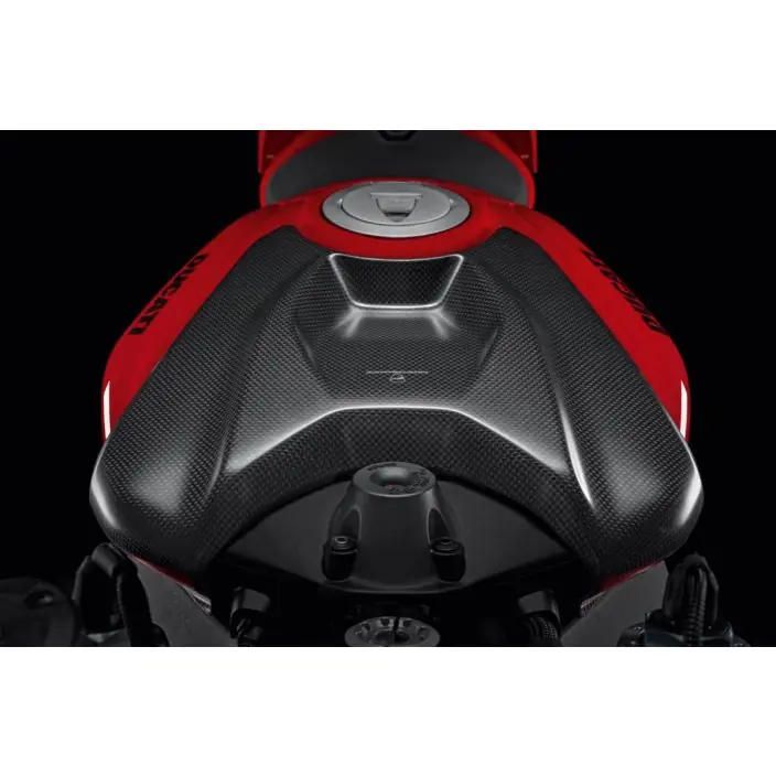Het carbon waarmee dit accessoire is gemaakt, versterkt het uiterlijk van de voorkant van de tank van de Panigale en trekt de aandacht. Een detail dat zeker niet onopgemerkt blijft, de lijnen passen perfect bij de race-uitstraling van deze sportmotor bij uitstek.