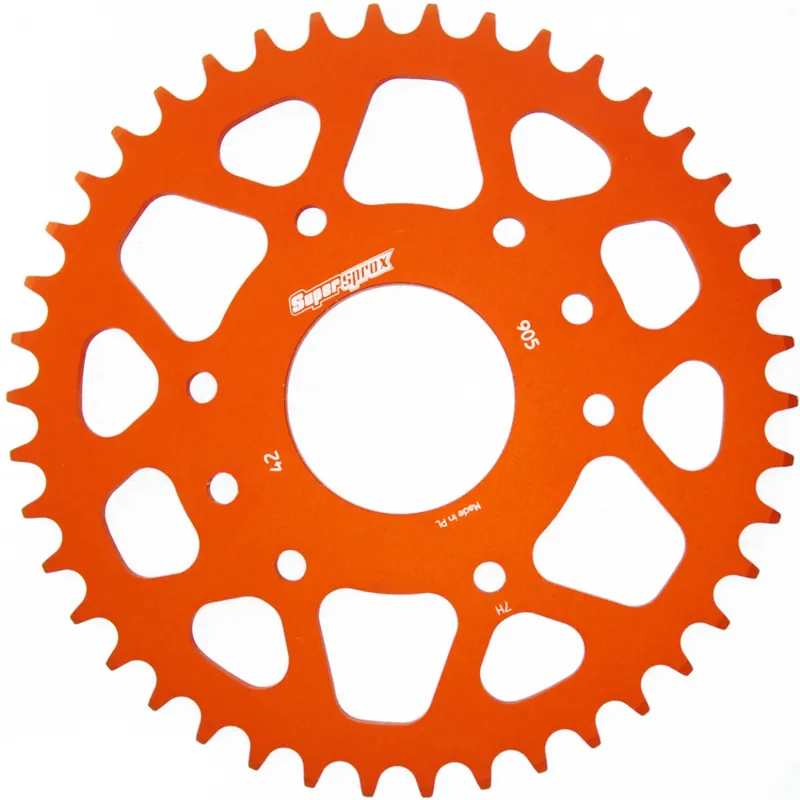 De SUPERSPROX REAR ALU 42T sprocket in een opvallende oranje kleur is ontworpen voor maximale prestaties en duurzaamheid. Met een tandwielverhouding van 42T en een 520 kettingmaat, biedt deze sprocket een ideale combinatie van kracht en efficiëntie voor jouw motor of scooter.