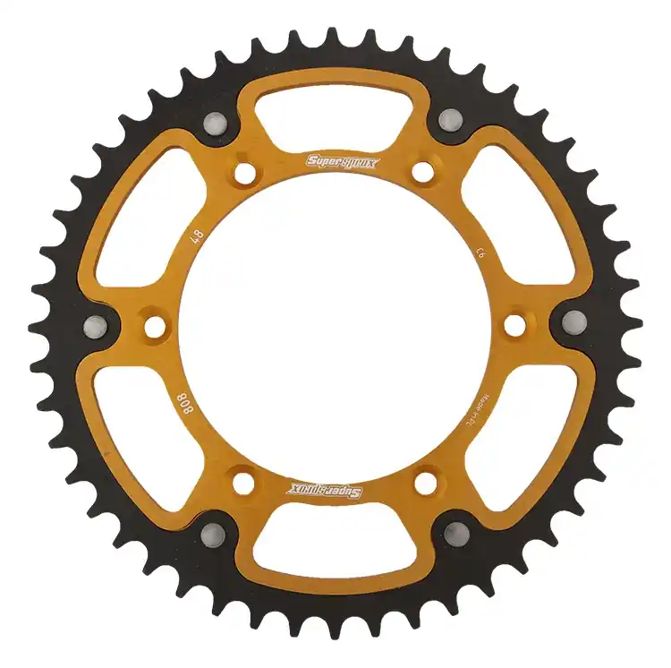 Maak kennis met het SUPERSPROX REAR STEALTH 48T, een hoogwaardige achtertandwiel dat speciaal is ontworpen voor verschillende modellen van Suzuki motoren en scooters. Dit 48-tands sprocket in een stijlvolle gouden afwerking is niet alleen een lust voor het oog, maar biedt ook uitstekende prestaties.